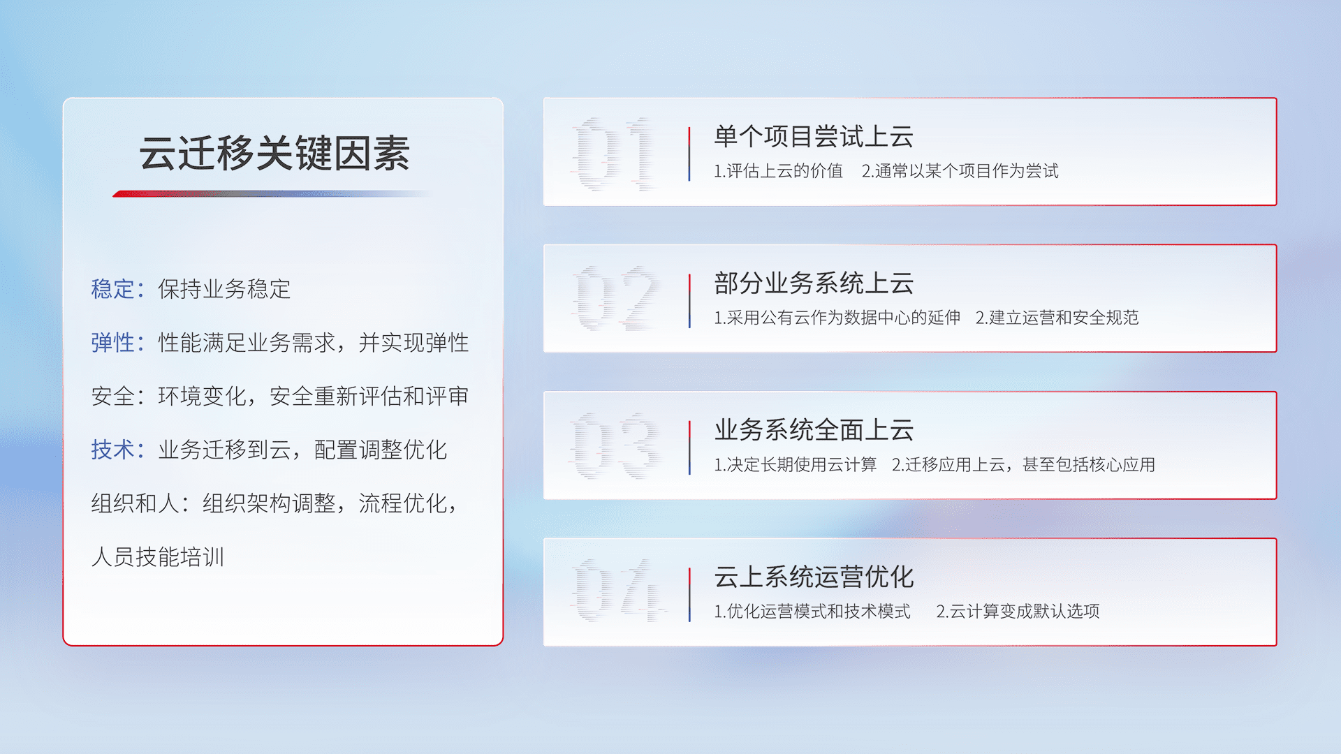 结合实际业务,,从规划设计、、云平台选型、、、、云原生改造、、、、数据迁移、、、、集成交付,,,,迁移全过程为客户识别最佳上云路径,,做好风险识别管理,,,,设计网络架构、、、身份权限、、安全审计合规、、、操作审计、、、、日志审计、、、、监控告警策略、、、、多站点容灾设计等,,对云上基础设施进行整体规划,,,,提升IT治理水平,,以满足弹性、、、高可用、、、、高性能的需求。。。。