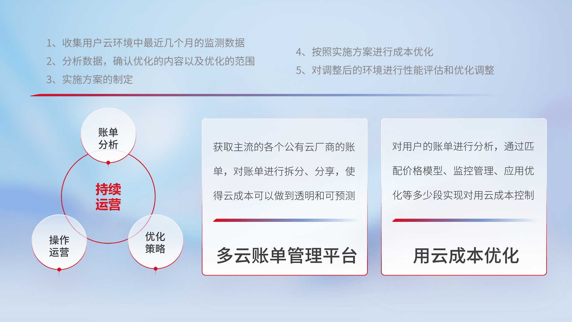 通过多云纳管,,以统一的资源数据模型把客户的云资源进行抽象和封装,,进而实现对多云资源的统一操作,,保障云资源管理的可靠性、、稳定性与可用性。。量身定制化运维内容,,,配置、、、开发运维、、、、补丁管理、、备份、、、、监控、、认证和访问管理、、、审计和日常巡检等,,,,保障在用云过程中的可靠度,,稳定度以及高可用率。。。。